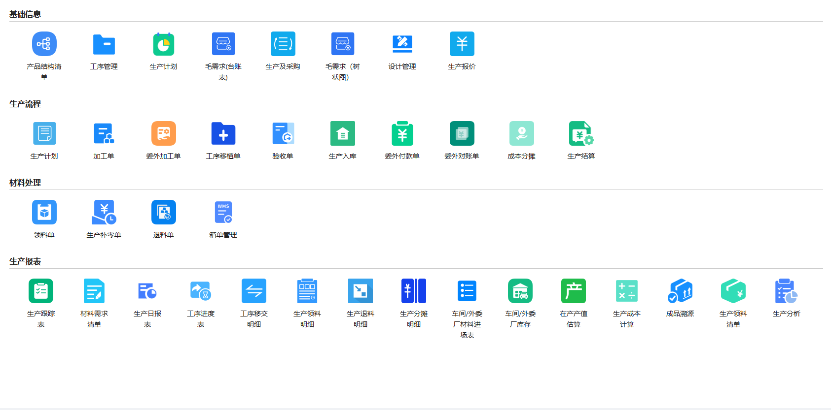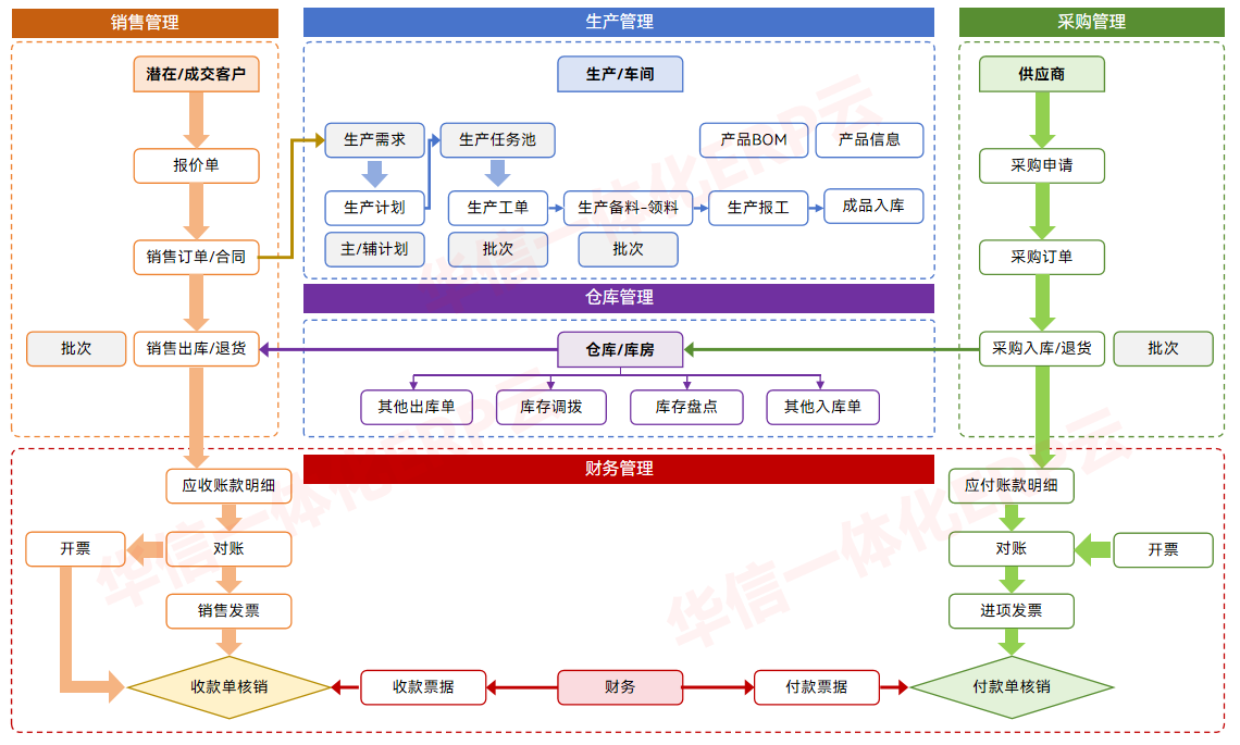 供应链管理(SCM)、销售与市场、分销、客户服务、财务管理、制造管理、库存管理、工厂与设备维护、人力资源、报表、