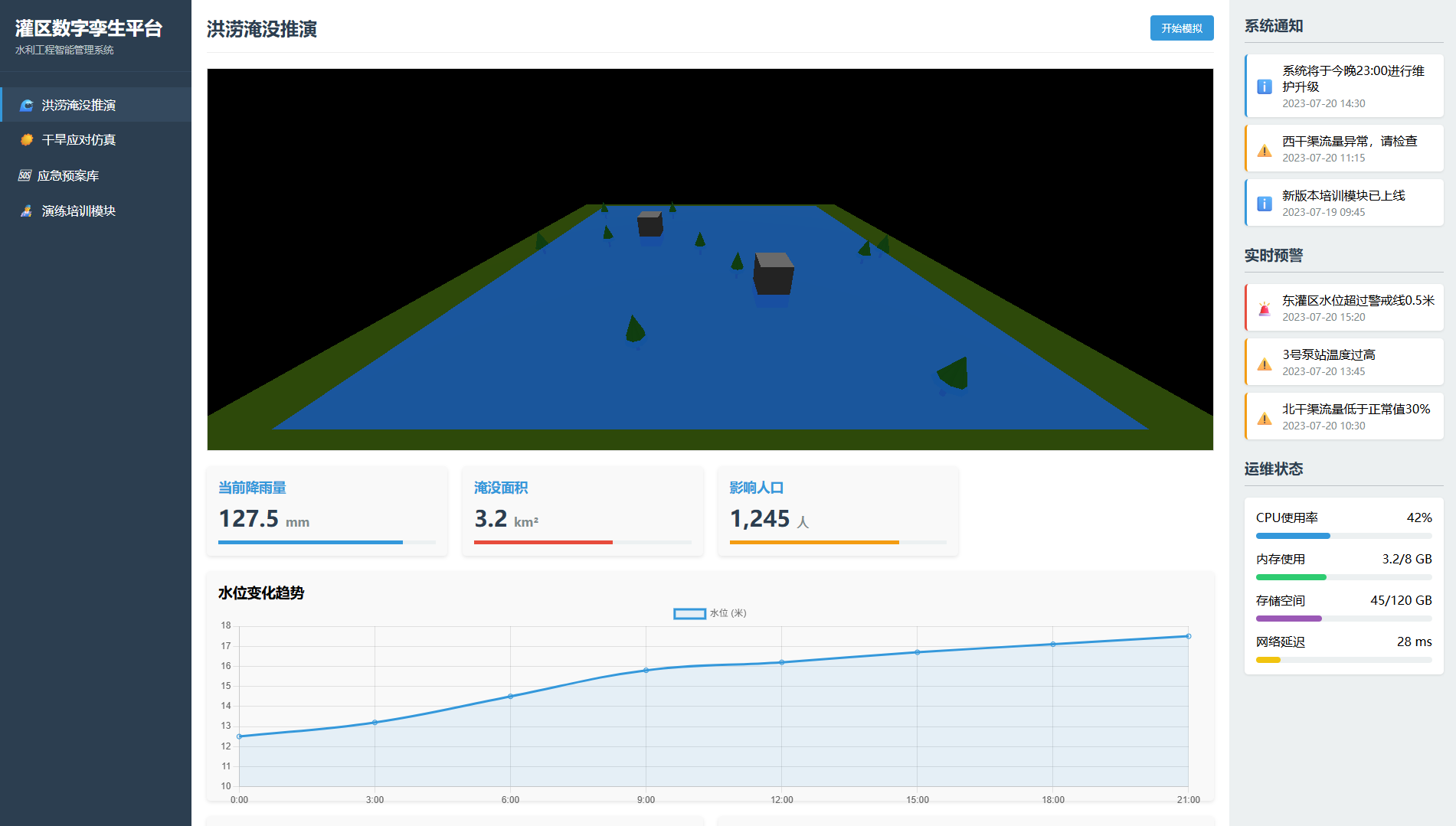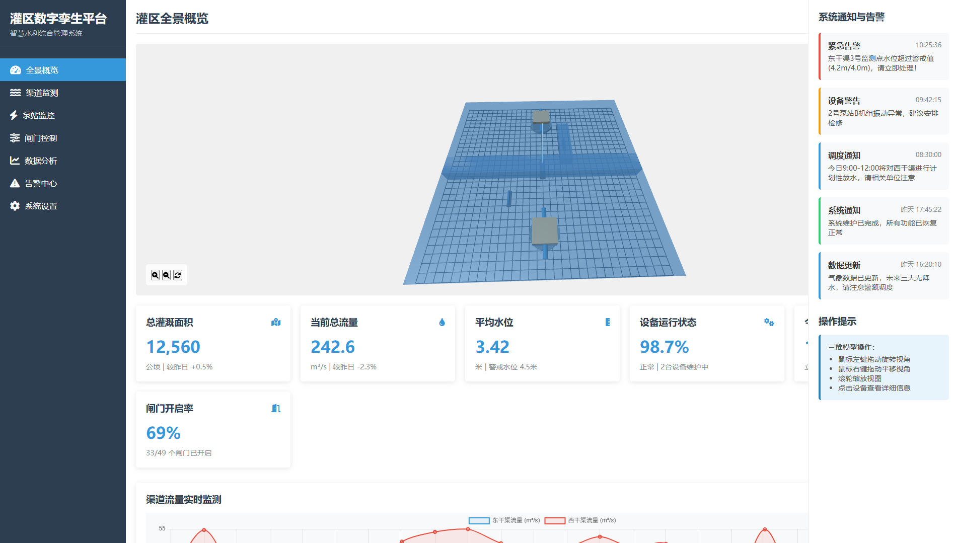 采用BIM+GIS技术构建灌区渠道、闸门、泵站等设施的毫米级精度三维模型。