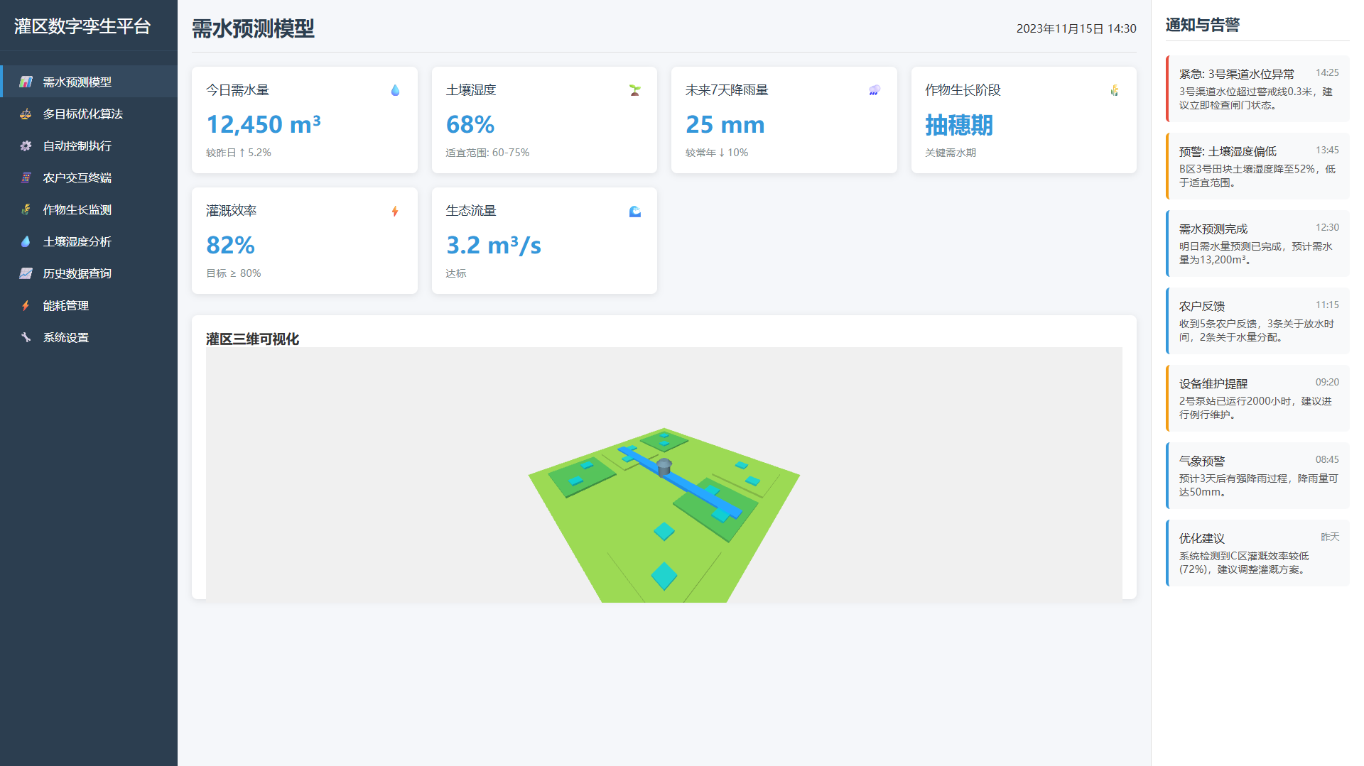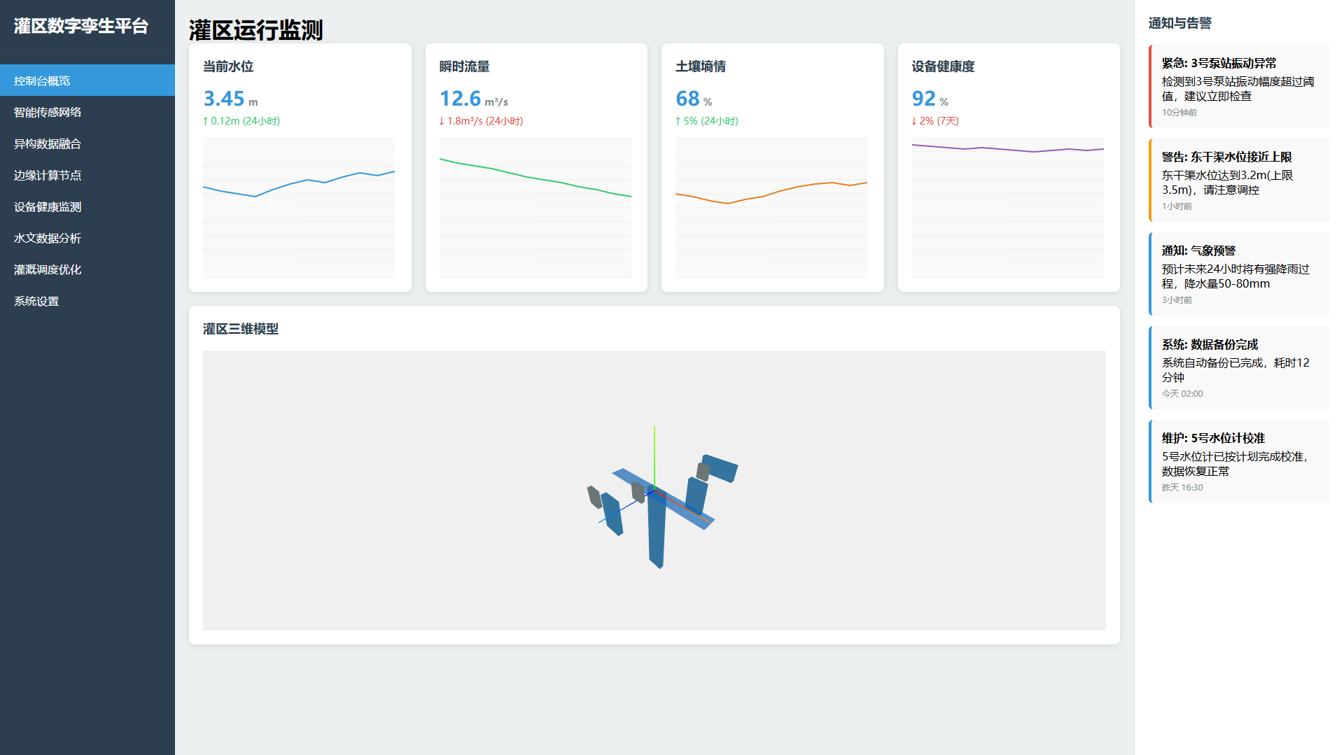 部署水位计、流量计、土壤墒情仪等设备,实现分钟级数据采集。
