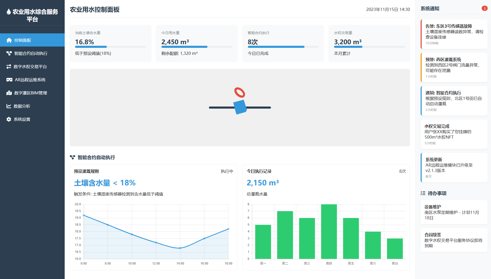 预设灌溉规则(如土壤含水量<18%时触发),通过IoT设备自动执行并记录链上凭证。