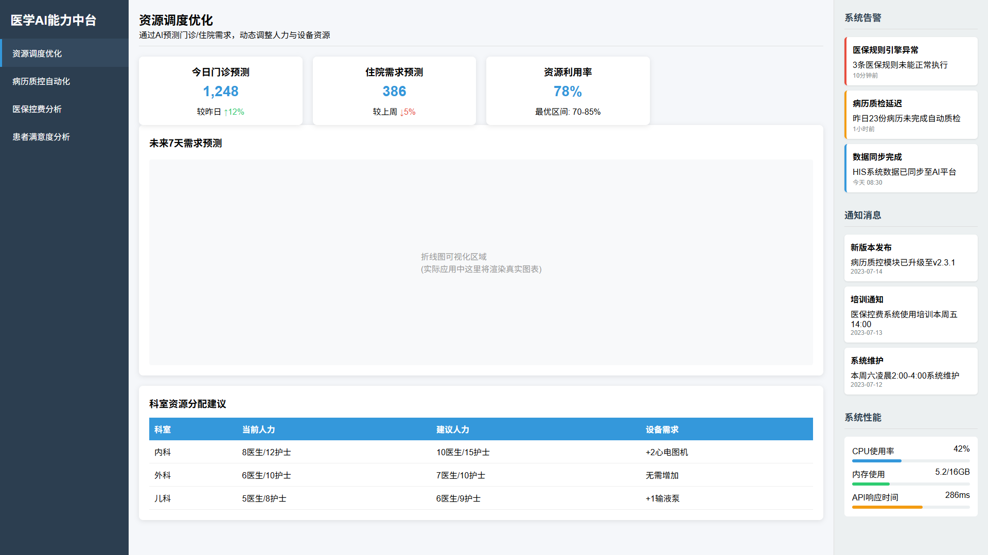 通过AI预测门诊/住院需求,动态调整人力与设备资源。