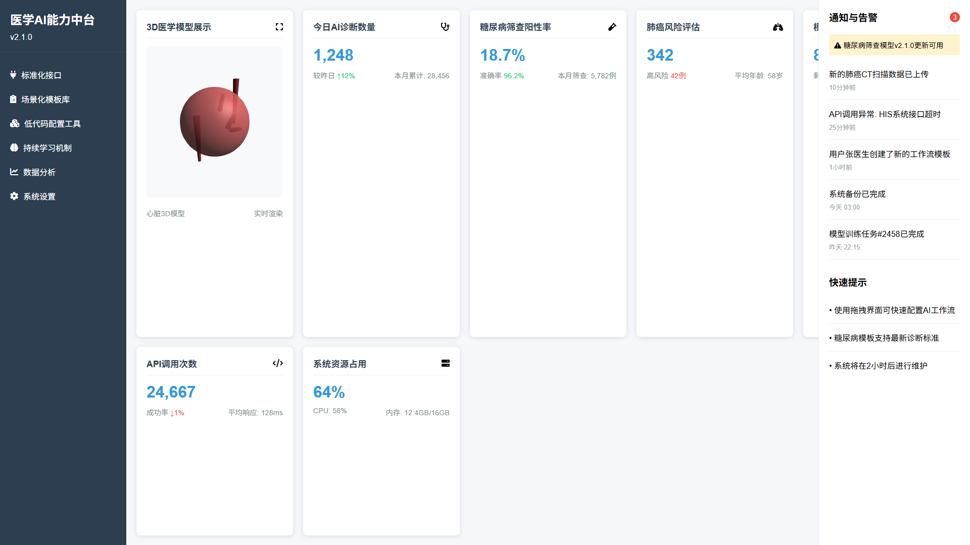 预置常见病种(如糖尿病、肺癌)的AI应用模板。