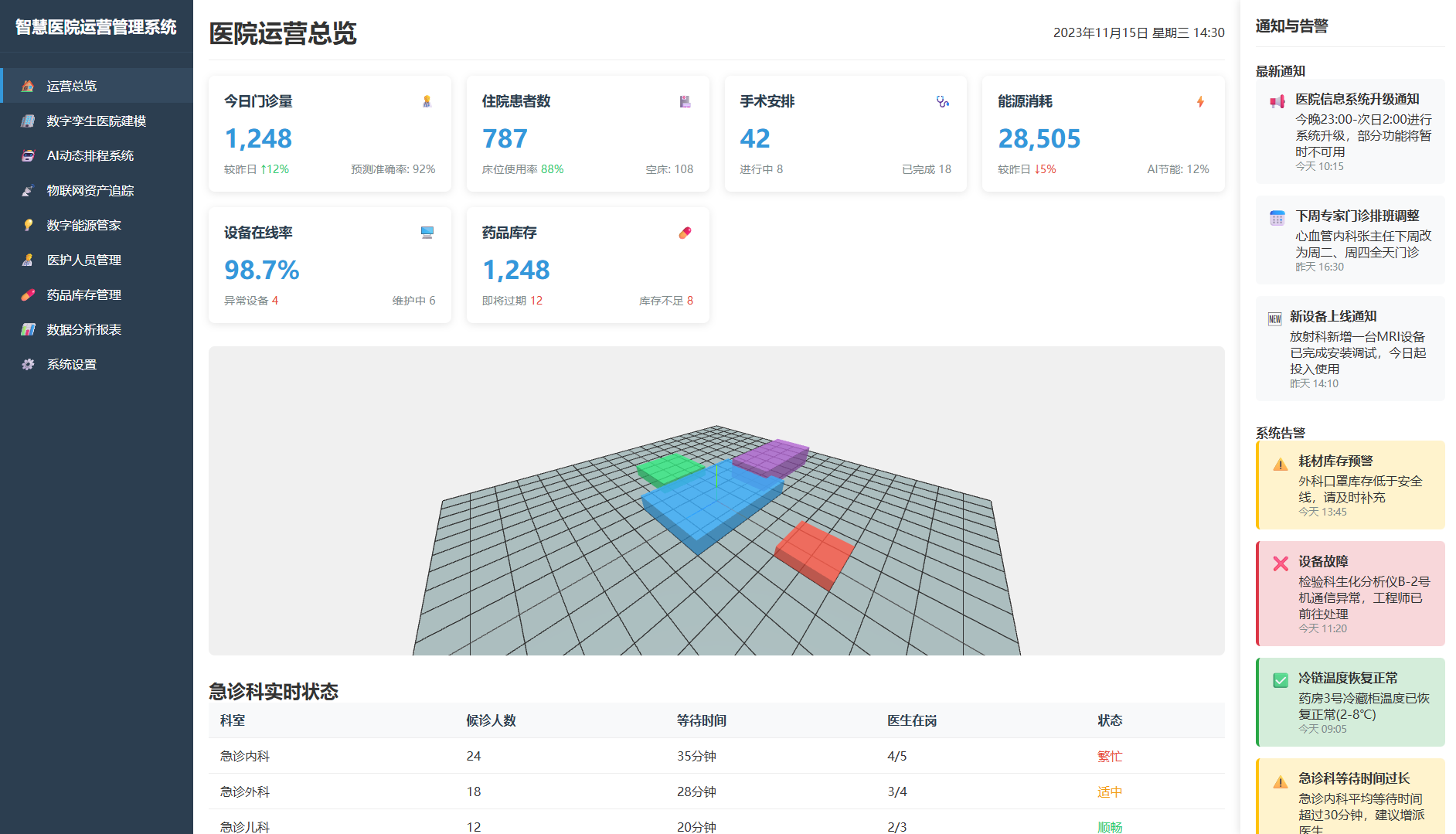通过3D/BIM构建全院虚拟映射,实时同步设备/人员/空间状态数据。