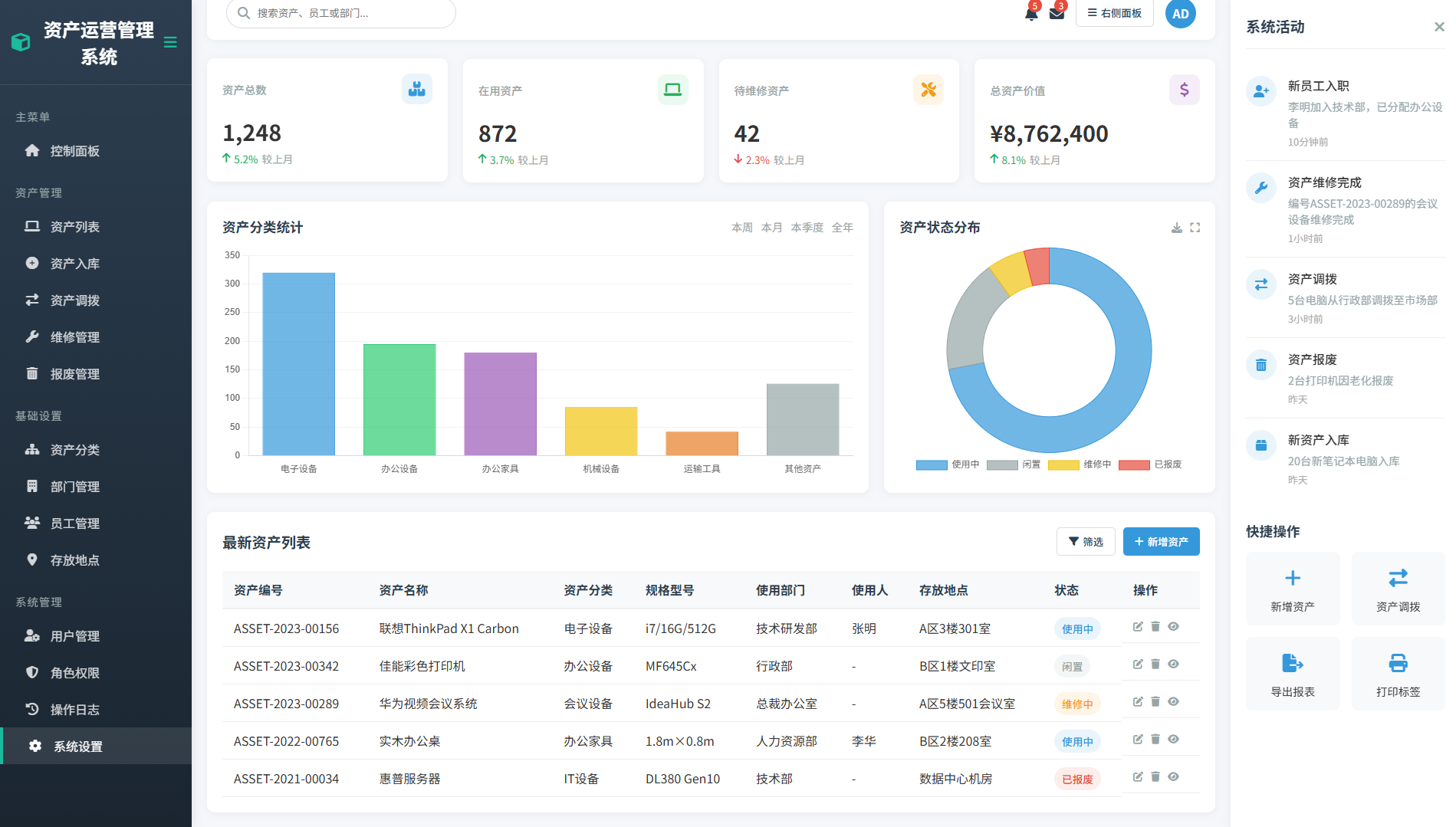 通过仪表盘展示资产健康度、利用率、成本分布等关键指标。
