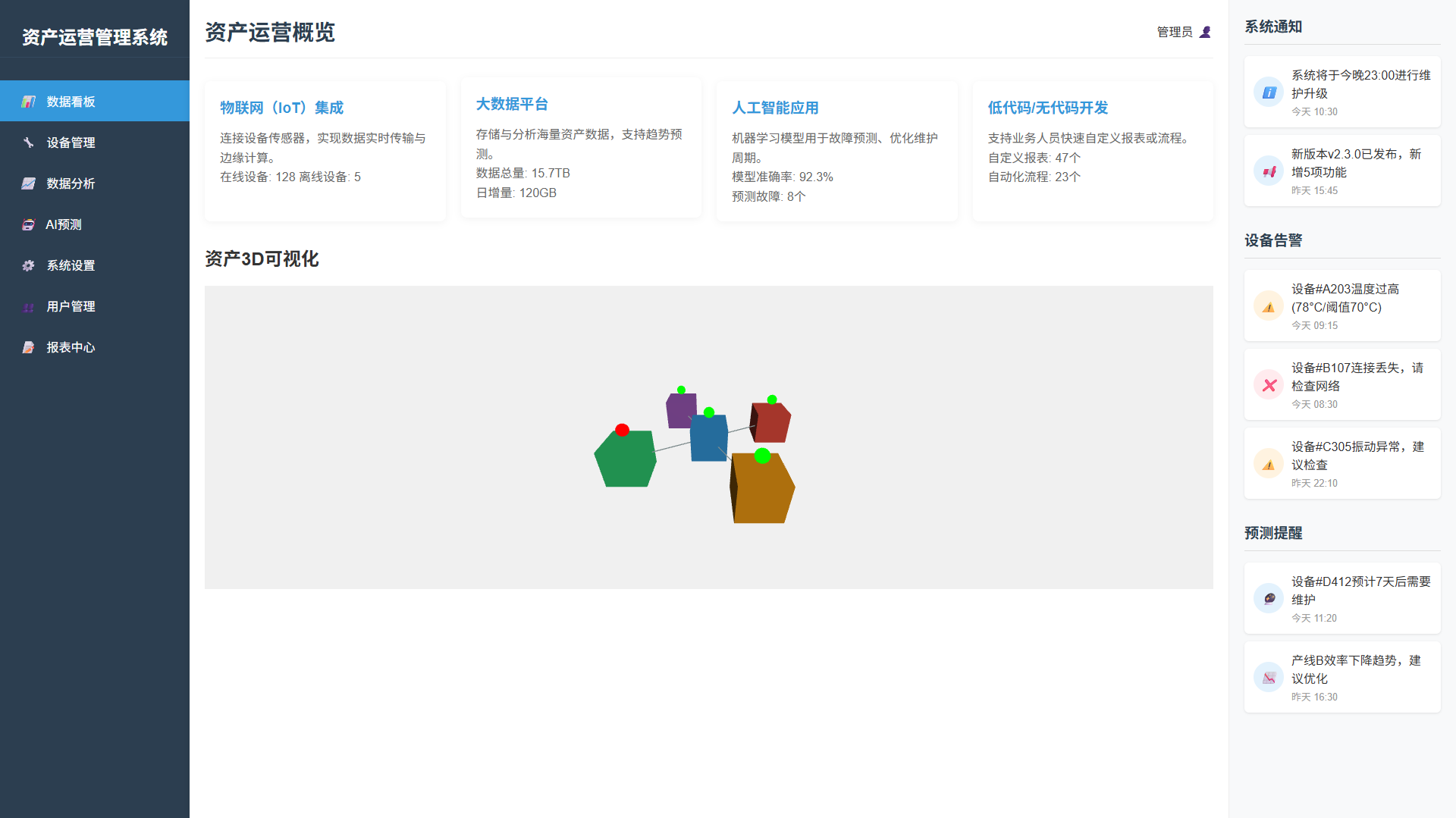 通过IoT传感器实时获取资产状态(如温度、能耗、故障信号)。